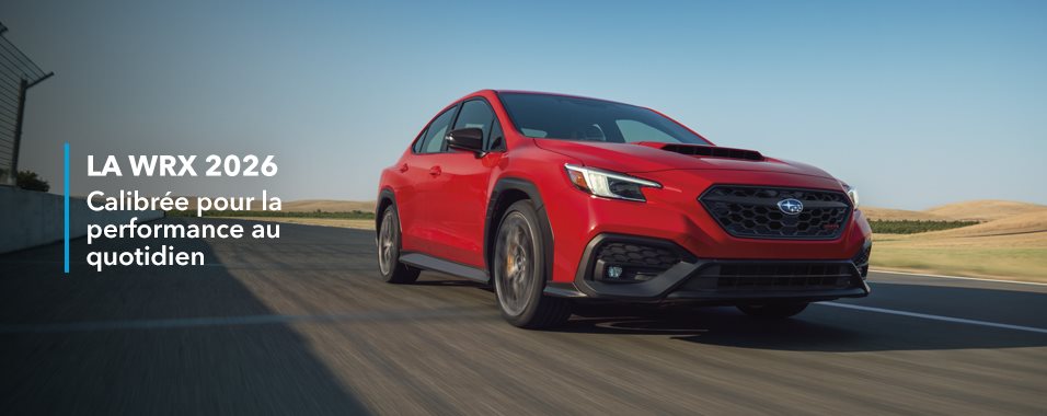 Découvrez la Subaru WRX 2026. Éprouvée au fil de décennies de compétition automobile, la WRX est la quintessence des voitures sport compactes. Le système de traction intégrale symétrique à prise constante Subaru livré de série, la configuration à quatre portes et le coffre s’unissent pour offrir des capacités et un agrément de conduite remarquables, quelles que soient les conditions climatiques ou routières. La fougue de ce bolide lui vient de son moteur BOXER® SUBARU turbo haute performance, de sa boîte manuelle à 6 rapports ultra précise ou de sa boîte automatique Subaru Performance Transmission® (SPT) en option, de son design extérieur féroce et de son habitacle orienté sur le conducteur. En primeur pour 2026, la gamme WRX accueille la fabuleuse nouvelle livrée de performance WRX édition Kaminari 雷, exclusive au Canada. Depuis plus de 30 ans, la Subaru WRX s’est taillé une réputation enviable auprès des passionnés de conduite du monde entier grâce à ses compétences, à sa qualité et à sa fiabilité irréprochable. Cette plus récente mouture ne fait pas exception.