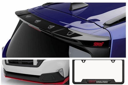 Bundle et économisez 10%! Comprend l'aileron de toit STI, l'aileron avant STI en rouge et le cadre de plaque d'immatriculation STI en noir mat.