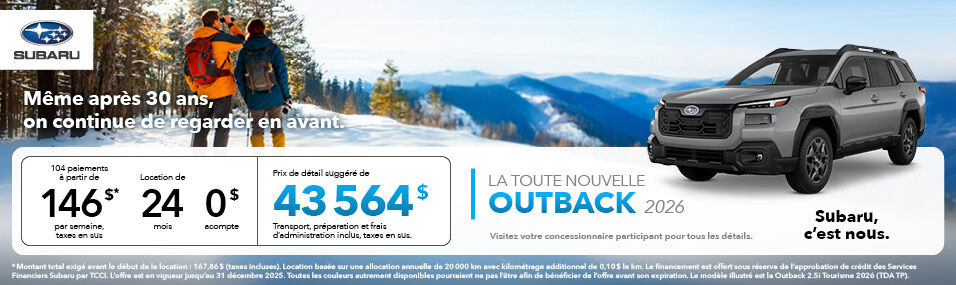 Le respect de votre vie privée est fondamental pour nous. Pour savoir comment Subaru Canada, Inc. protège les renseignements personnels que vous lui communiquez, veuillez consulter notre Politique de protection des renseignements personnels.
